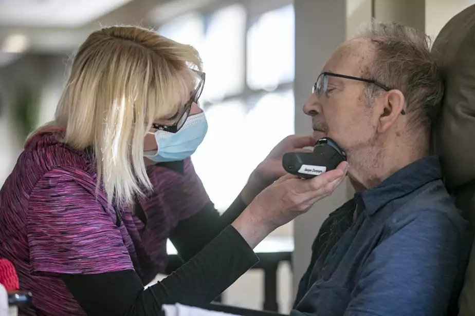 C’était par un lundi matin récent, au cinquième étage du CHSLD de Sainte-Dorothée, dans la salle de séjour baignée de soleil. Johanne, préposée aux bénéficiaires, rasait Georges Champagne, 85 ans.